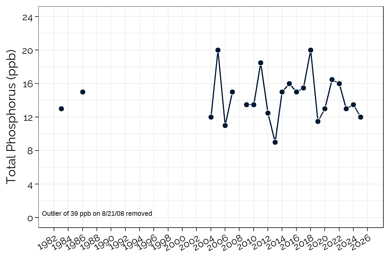 Since 1983, total phosphorus at Farrington Pond has revealed no statistically significant trend. Year-to-year variation in total phosphorus (10 to 20 ppb) is large at Farrington Pond, which also has the highest mean annual total phosphorus of all the ponds. Farrington Pond is highly susceptible to internal loading of phosphorus due to its shallow depth, where disturbance of bottom sediments can release phosphorus into the water column.