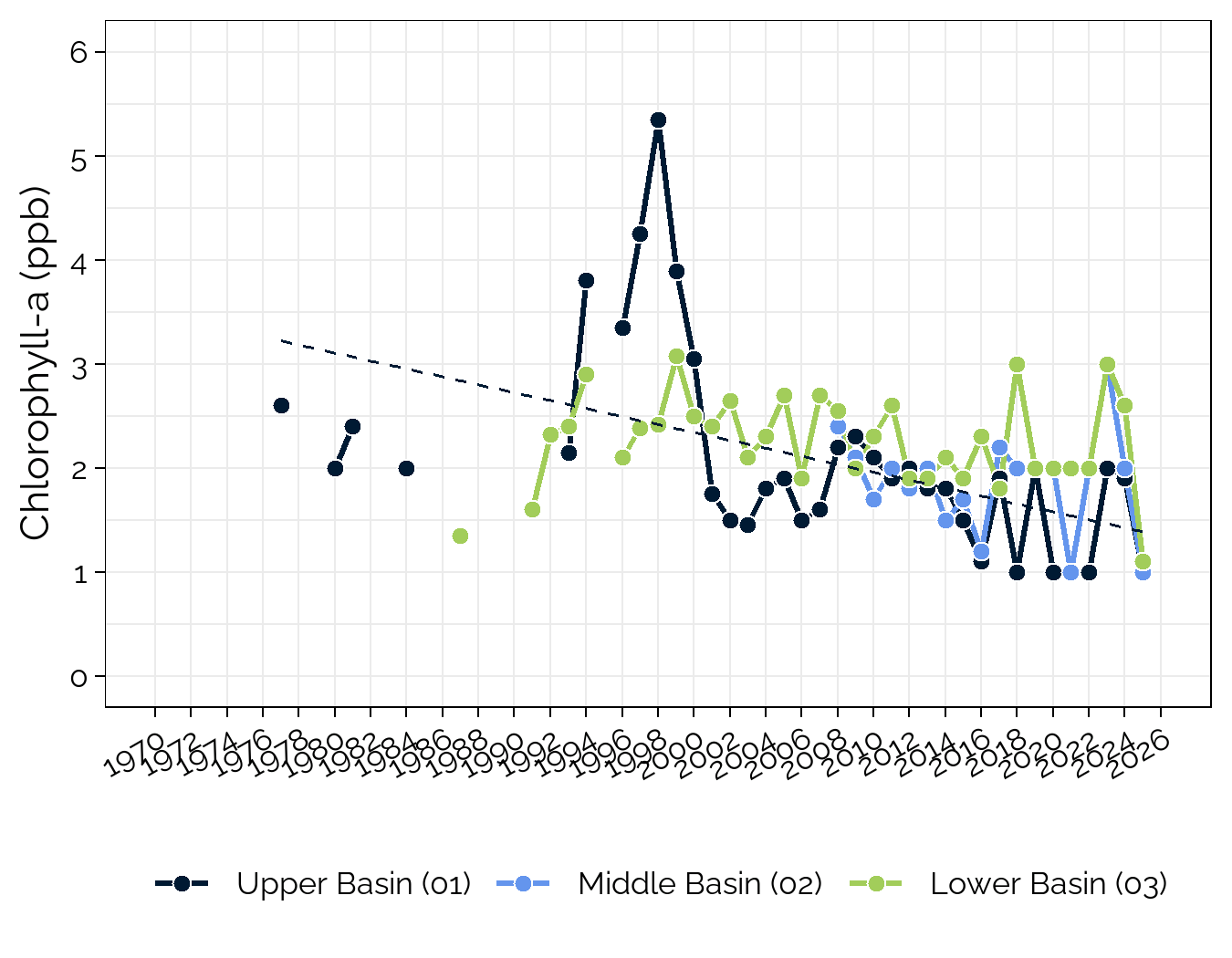 Since the late 1970’s, chlorophyll-a at the upper basin of Kezar Lake has improved, while chlorophyll-a at the middle and lower basins has revealed no statistically significant trend over time. The period from 1994 to 1999 saw a marked rise in chlorophyll-a at the upper basin, but chlorophyll-a has remained at or below 3 ppb since then. Nutrient-rich runoff entering the lake during wetter years, combined with warmer air temperatures, can fuel algal growth.