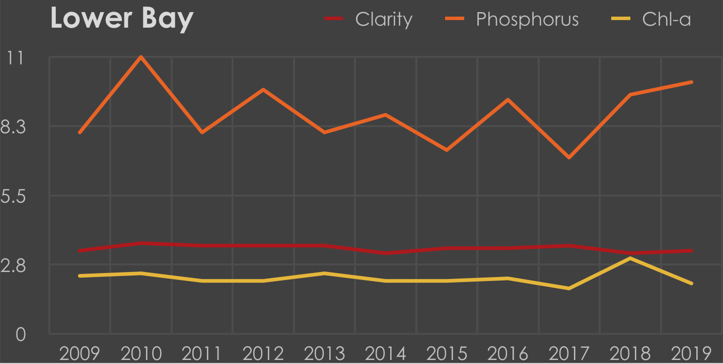 Phosphorous acts as a fuel that promotes the growth of algae in an aquatic environment. It occurs naturally in soil, but is also found in fertilizers and animal waste. Phosphorous is washed into lakes and streams by rainwater carrying eroded soil, plant residues, fertilizer, and/or animal waste. Since 1977, phosphorous measurements in Upper and Middle Bays have remained healthy with median values of 5.0 ppb and 4.5 ppb respectively. Lower Bay’s median value over this time has been 9.0 ppb. While this significantly higher than the deeper bays, it is still below the state median of 11.8 ppb. Fortunately, the high flush rate of water moving through the Lower Bay (fueled by the influx of Sucker Brook and flow from the Narrows) has enabled the trophic status of the Lower Bay to remain stable.